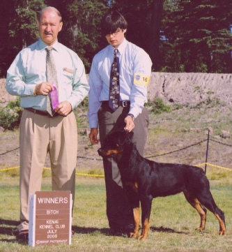 V1, Multi BOSS, A/C Ch. Pepperhaus Xena v. Stoneridge, A/C CDX, BN, GN, RAE3, PT, HSAs, CGC came to me from my good friend Sandy West of Pepperhaus Rottweilers. Xena was a great friend, travel partner and worker. Xena was the dam to my G, J and L litters and lived to be over 13 years old.